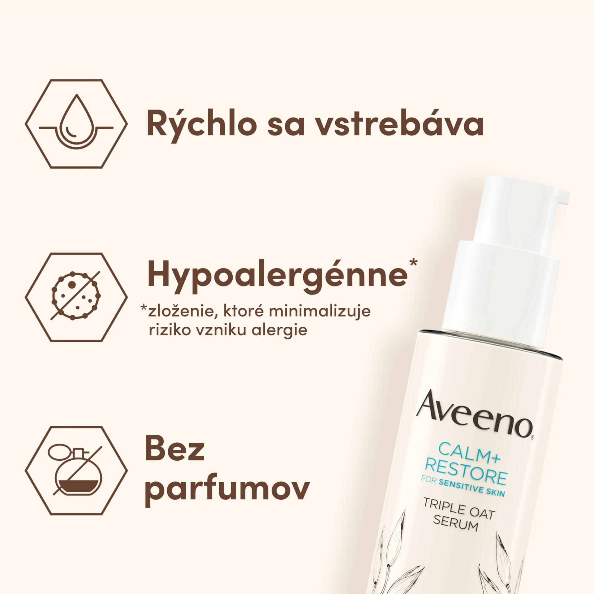 Aveeno® Calm+Restore™ Pleťové sérum s trojitým ovseným komplexom okamžite vyhladzuje a upokojuje citlivú pleť. Ľahko vstrebateľné sérum so 100 % čistým, výživným ovsom posilňuje kožnú bariéru a dodáva pleti hydratáciu a výživu. Doprajte svojej pleti 24-hodinovú hydratáciu už po jednom použití. Aveeno® Calm+Restore™ Pleťové sérum obsahuje Trojitý ovsený komplex (koloidná ovsená múka, výťažok z ovsa a ovsený olej), ktorý upokojuje a regeneruje pleť a obnovuje kožnú bariéru, a upokojujúcu rimbabu, známu svojimi antioxidačnými vlastnosťami a upokojujúcim účinkom na pokožku.
