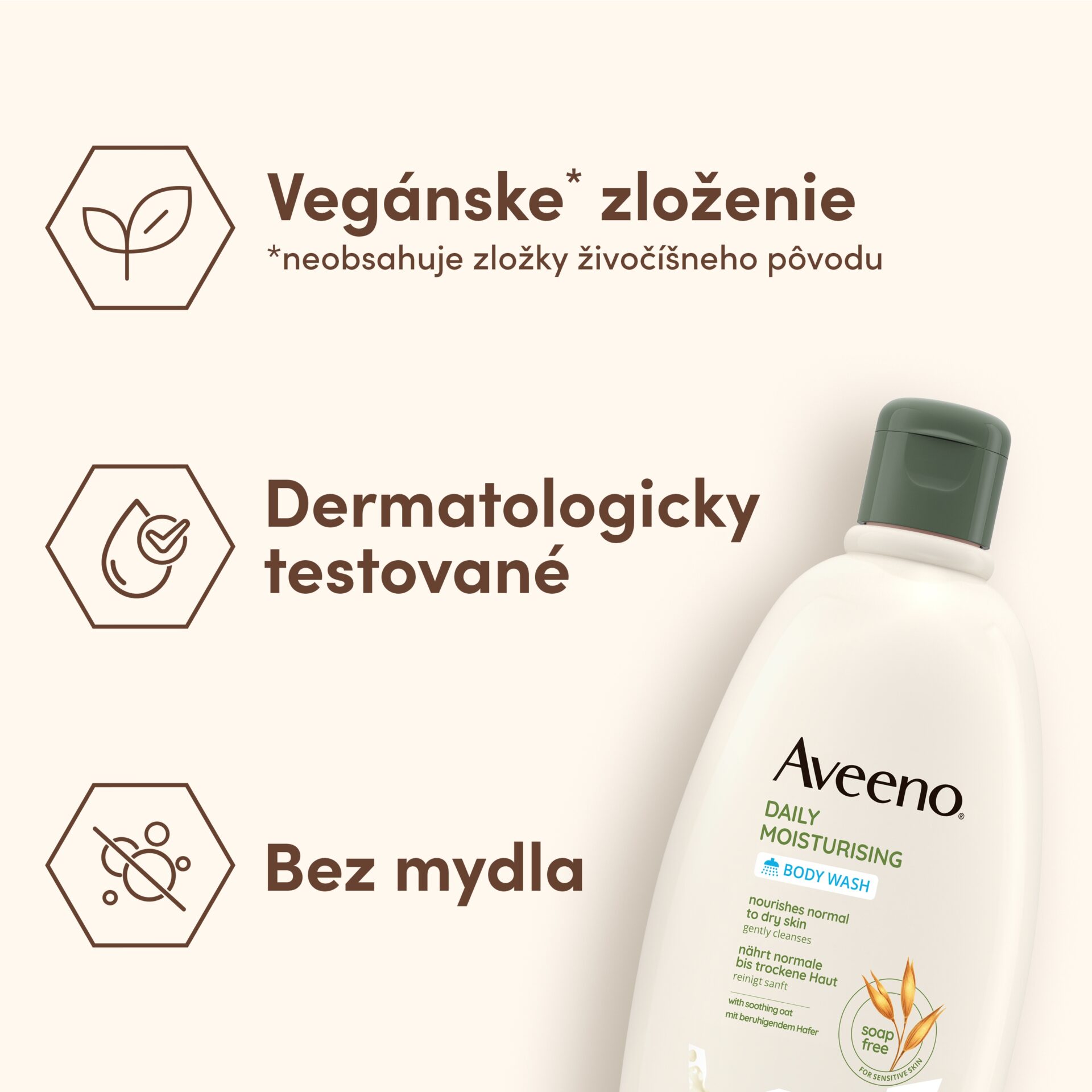 Aveeno® Daily Moisturising hydratačný sprchovací gél s upokojujúcim ovsom jemne čistí pokožku bez toho, aby ju vysušoval, a pomáha udržiavať prirodzenú kožnú bariéru. Zloženie, ktoré neobsahuje mydlo, je vegánske* a z 95% biologicky odbúrateľné, pomáha udržiavať rovnováhu prirodzeného kožného mikrobiómu. Aveeno® Daily Moisturising Hydratačný sprchovací gél je jemne parfumovaný a je ideálny na normálnu až suchú, citlivú pokožku.
