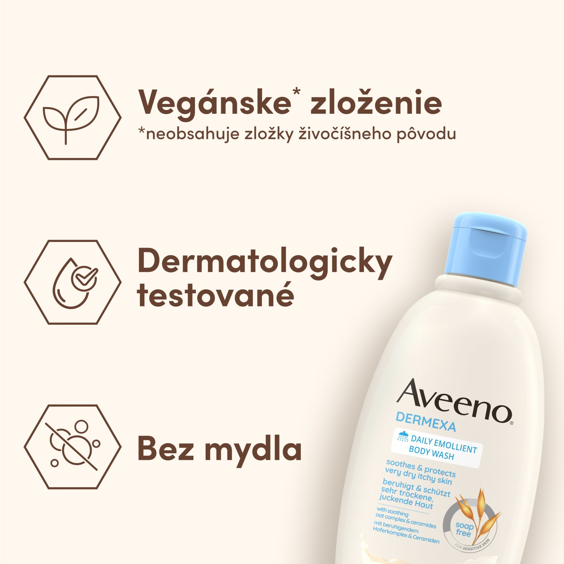 Aveeno® Dermexa emolienčný sprchovací gél má unikátne, klinicky overené zloženie s vysokou toleranciou, s obsahom upokojujúceho ovseného komplexu a ceramidov. Jemne čistí bez toho, aby vysušoval, a zanecháva veľmi suchú, svrbiacu, citlivú pokožku upokojenú a vyživenú. Pri použití v kombinácii s Aveeno® Dermexa Emolienčným telovým krémom pomáha zlepšiť rovnováhu prirodzeného kožného mikrobiómu pre zdravšie vyzerajúcu a odolnejšiu pokožku už od 1. dňa. Vhodný pre dospelých a deti staršie ako 3 roky, vrátane osôb, ktoré sú náchylné na kožné ochorenia, ako sú ekzémy.