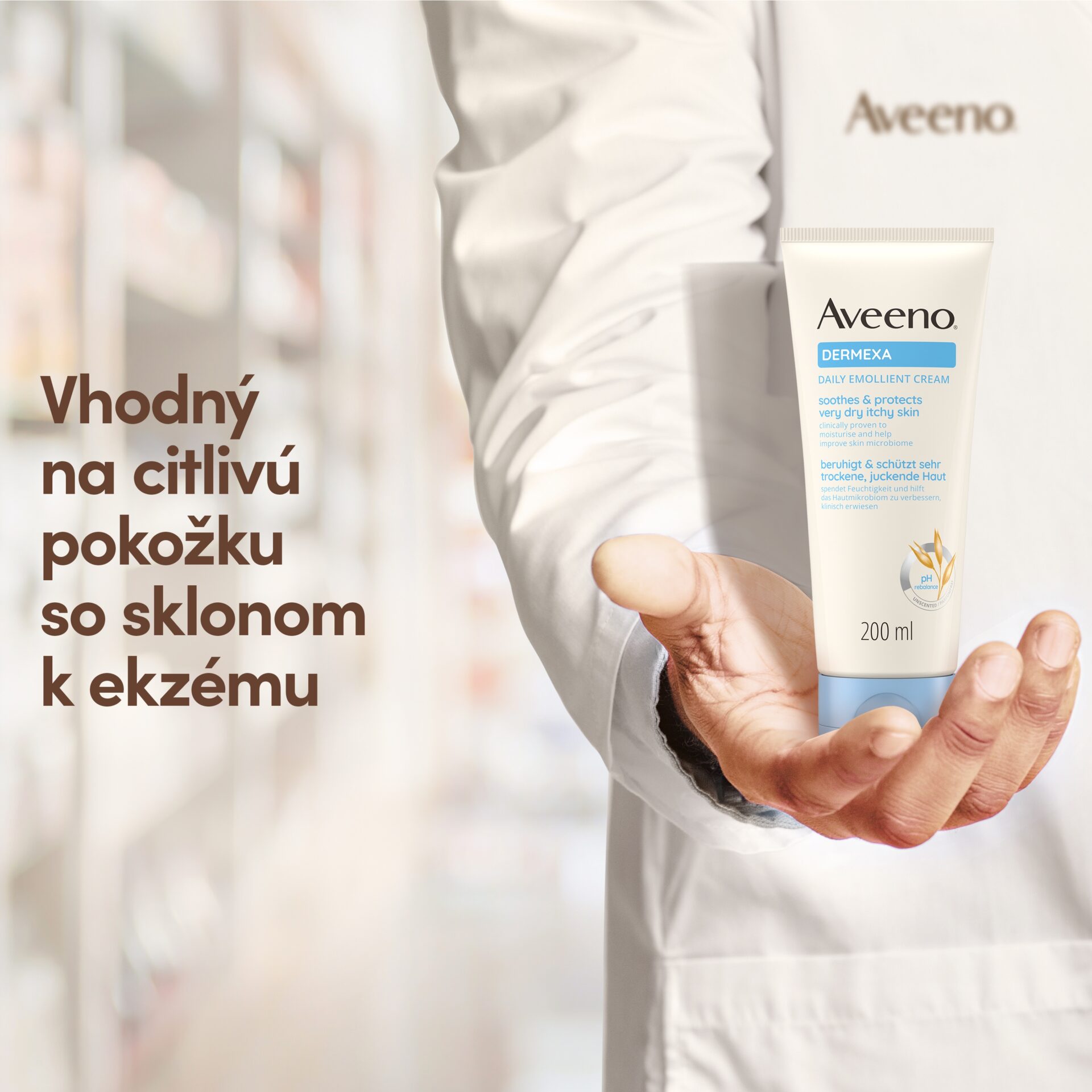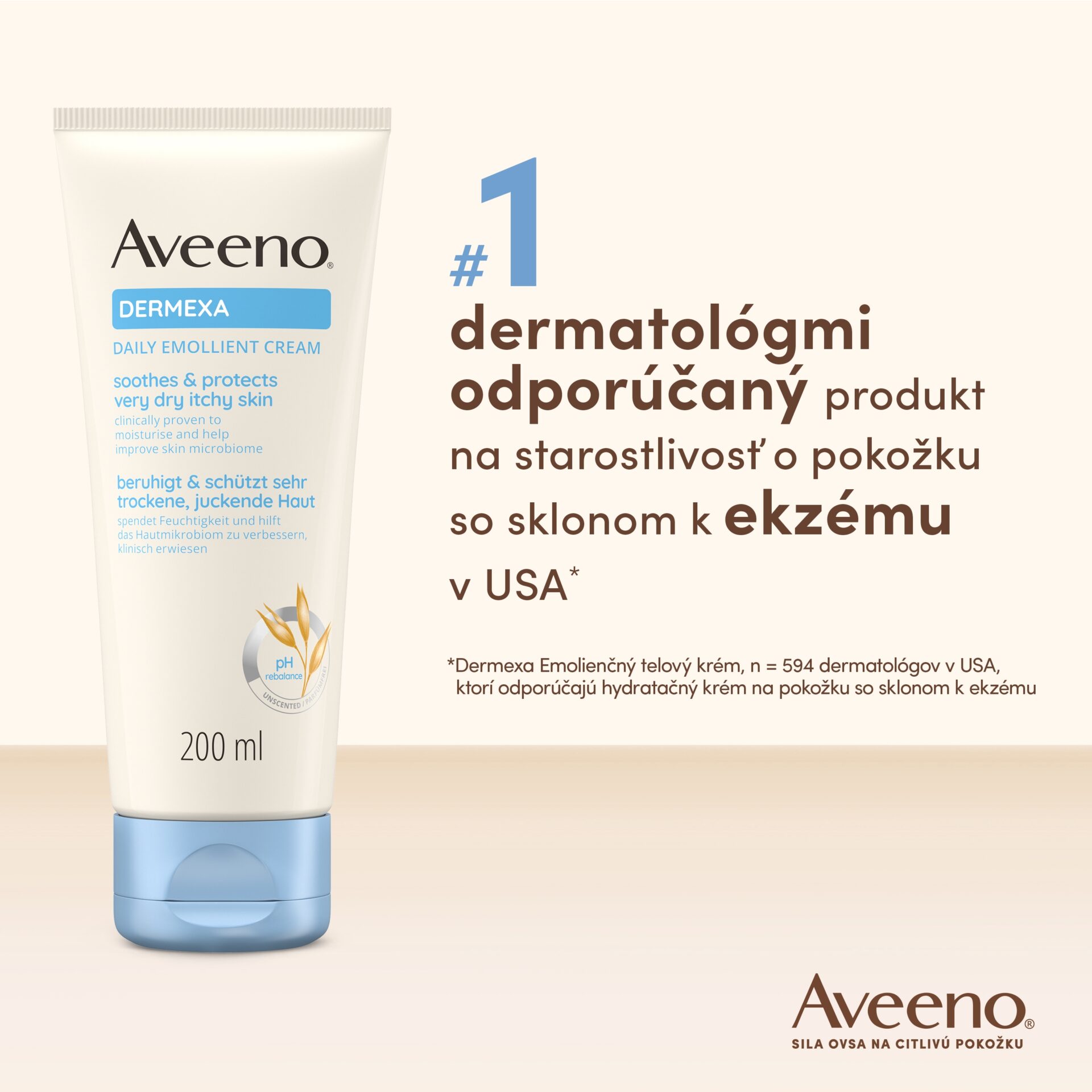 Aveeno® Dermexa Emolienčný telový krém má nemastné, vegánske* zloženie, ktoré kombinuje upokojujúci trojitý ovsený komplex s ceramidmi. Krém pomáha upokojiť a chrániť veľmi suchú a svrbiacu pokožku. Zároveň posilňuje prirodzenú kožnú bariéru. Aveeno® Dermexa Emolienčný telový krém hydratuje pokožku a dodáva jej okamžitý pocit komfortu. Je vhodný aj na pokožku so sklonom k ekzému. Pomáha posilňovať kožnú bariéru a zlepšovať prirodzenú rovnováhu kožného mikrobiómu, pre pokožku zdravú a pružnú na pohľad už od prvého dňa.