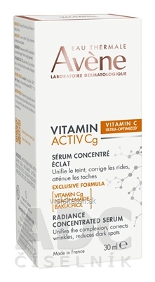 Starnutie buniek vedie k postupnému zhoršovaniu funkcie tkanív. Dôsledkom je výskyt klinických príznakov na úrovni kože, ako sú suchosť, pigmentácia, ochabnutosť a vrásky. Dermatologické laboratóriá Avène vytvorili korekčné sérum na rozjasnenie pleti, ktoré obsahuje 3 dermatologicky účinné látky: [VITAMÍN Cg*] 1,8 %: známy pre svoj antioxidačný účinok, zodpovedá 20 % vitamínu C** [NIACINAMID] 3 %: dlhodobo regeneruje pleť a redukuje výskyt škvŕn [BAKUCHIOL] 1,5 %: uznávaný ako rastlinná alternatíva retinolu, koriguje vrásky. Vďaka vzájomne sa doplňujúcej kombinácii účinných látok poskytuje toto sérum okamžitý rozjasňujúci efekt. Okamžite: pleť len žiari***. Po 15 dňoch: pleť je vyhladená*** a vypnutá 95 %****. Po 1 mesiaci: tmavé škvrny sú redukované*****. Vitamín Activ Cg korekčné sérum na rozjasnenie pleti je prípravok testovaný na citlivej pleti, obsahuje 94 % zložiek prírodného pôvodu, bez zložiek živočíšneho pôvodu.
