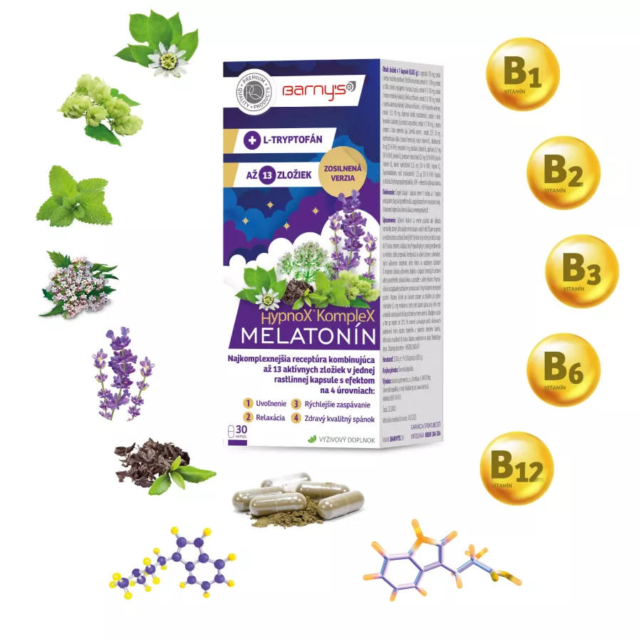 HypnoX® KompleX MELATONÍN od Barny’s® je kombinovaný výživový doplnok obsahujúci *melatonín, ktorý prispieva k skráteniu času potrebného na zaspanie a k zmierneniu subjektívnych pocitov únavy po