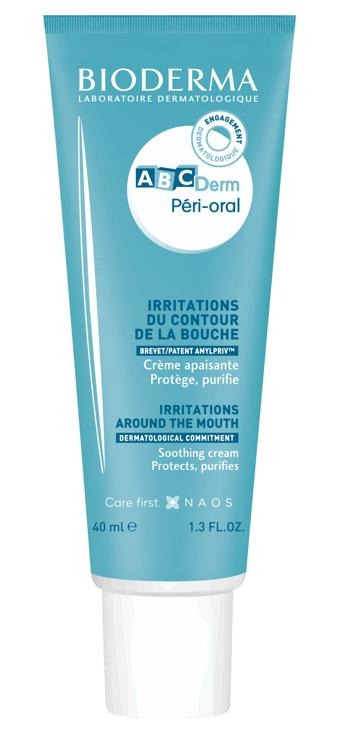 ABCDerm Péri-oral je vyvinutý v súlade s dermatologickým záväzkom ABCDerm tak, aby rešpektoval jemnú pokožku najmenších i starších detí. Je špecificky formulovaný tak, aby upokojoval, čistil a chránil podráždenú pleť v okolí úst najmenších i starších detí a bránil výskytu vyrážky a podráždenia. Patent Amylpriv inhibuje alfa amylázu (slinné enzýmy), a bráni tak tvorbe vyrážok a dráždeniu. Enoxolón, Panthenol, Beta-Sitosterol a Allantoin upokojujú podráždenie a zmierňujú vyrážky. Kombinácia medi a zinku má antibakteriálne a čistiace účinky.