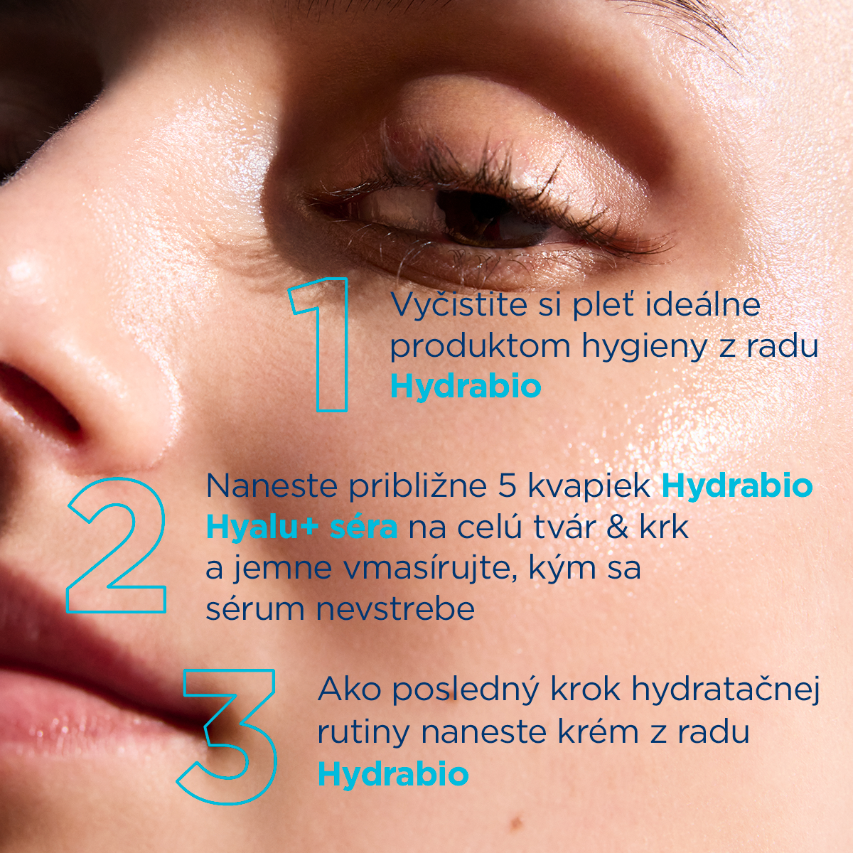 Aplikujte približne 5 kvapiek ráno a/alebo večer priamo na tvár a krk po očistení produktom hygieny z radu Hydrabio. Následne použite produkt starostlivosti o pleť z radu Hydrabio.