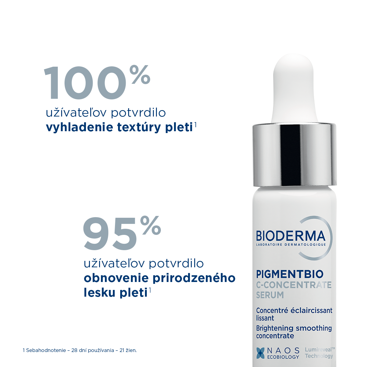 Vďaka inovatívnej LUMIREVEAL TECHNOLÓGIÍ pôsobí na všetky fázy tvorby tmavých škvŕn. Táto inovácia, ktorá pochádza z laboratórií Bioderma, je inšpirovaná poprednými liečebnými postupmi dermatológov a obsahuje látky, ktoré posilňujú obnovu buniek. Biologicky pôsobí na všetky fázy tmavých škvŕn už od ich vzniku a účinne ich eliminuje. Podporuje obnovu buniek a tak predchádza prebytočnému hromadeniu melanínu v bunkách. Znižuje tak intenzitu a veľkosť existujúcich pigmentových škvŕn a vyhladzuje štruktúru pokožky, čím jej prinavracia stratený jas.