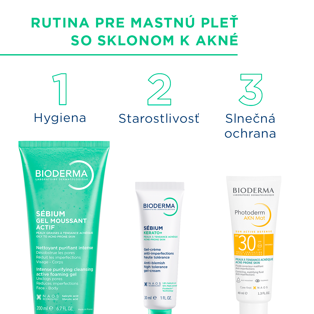 Koža sa behom puberty mení: je hrubšia, lesklá, objavujú sa na nej nedokonalosti rôzneho stupňa závažnosti, ktoré niekedy pretrvávajú až do dospelosti. Pokožka so sklonom k akné je chronické zápalové ochorenie spôsobené hormonálnou nerovnováhou, nadbytkom nekvalitného kožného mazu a množením baktérií C.acnes. Akné kombinuje dva typy lézií: Komedonálne, to sú mikrocysty a komedóny (často nazývané čierne bodky) a zápalové: papuly, pustuly alebo uzlíky, ktoré môžu vyústiť až k tvorbe jaziev. Závažnosť akné sa pohybuje od ľahších foriem, označovaných ako „fyziologické“, až po extrémne závažné formy. Kľúčovým krokom pri zvládnutí tohto ochorenia je čistenie pleti. V rámci liečby je nutná každodenná starostlivosť s čistiacim produktom vhodným pre mastnú pokožku a pleť so sklonom k akné, ktorý je pacientom predpisovaný. Jedná sa o prvú fázu liečby.