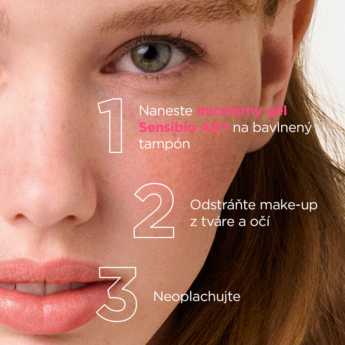 Naneste na vatový tampón a jemne očistite alebo odlíčte make-up z tváre a očí. Opakujte, dokiaľ nie je tampón čistý. Nie je potreba oplachovať. Používajte spoločne s produktami SENSIBIO AR+.