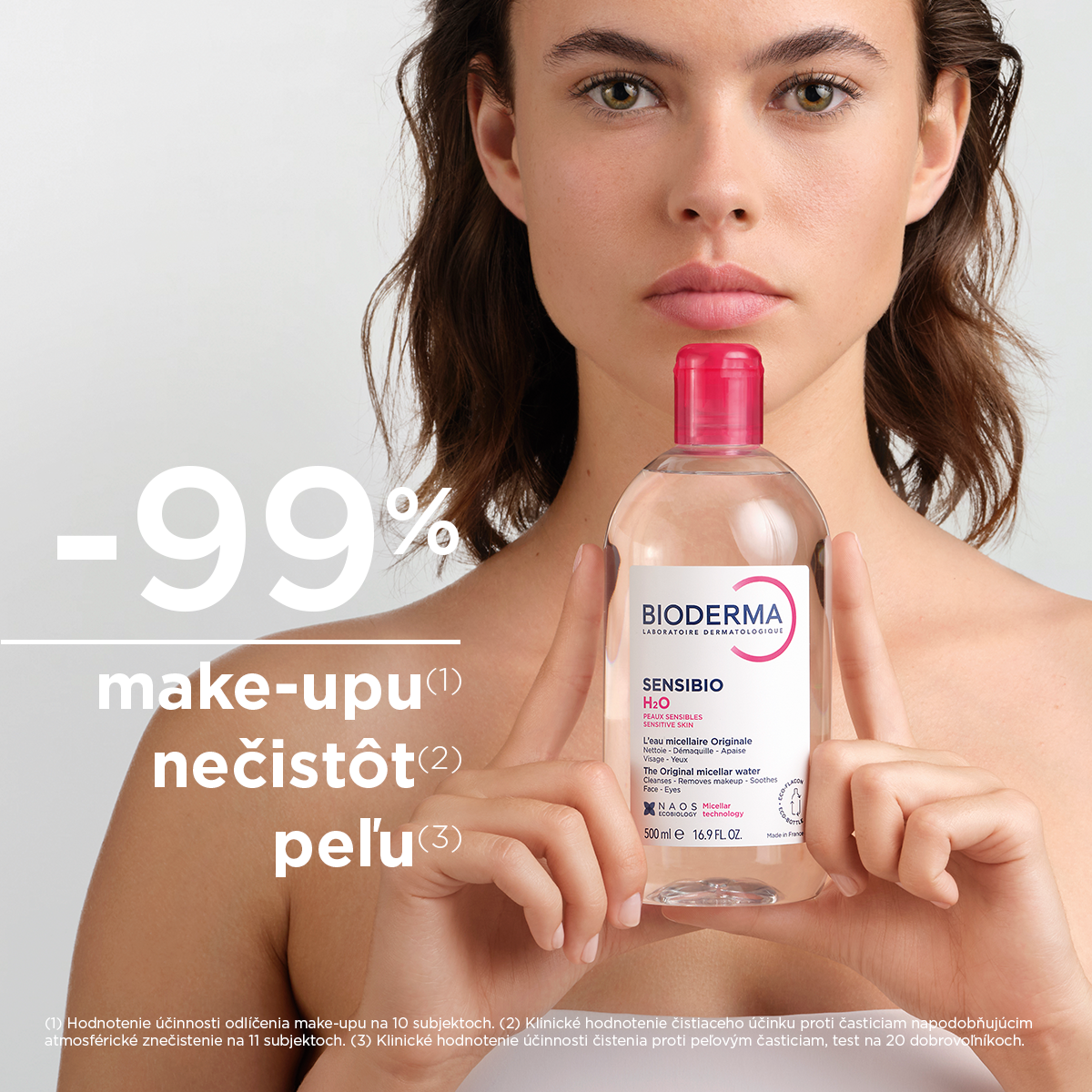 Ikonická čistiaca micelárna voda BIODERMA Sensibio H2O obsahuje komplex účinných látok, ktoré sú špeciálne vytvorené pre potreby citlivej pleti. Micelárna technológia obsahuje iba jeden šetrný čistiaci prvok, ktorý je dokonale kompatibilný s pleťou, je vysoko účinná pri odstraňovaní všetkých typov nečistôt (peľov, znečistenia, make-upu), pričom rešpektuje bariérovú funkciu pleti a rozmanitosť jej mikrobiomu.