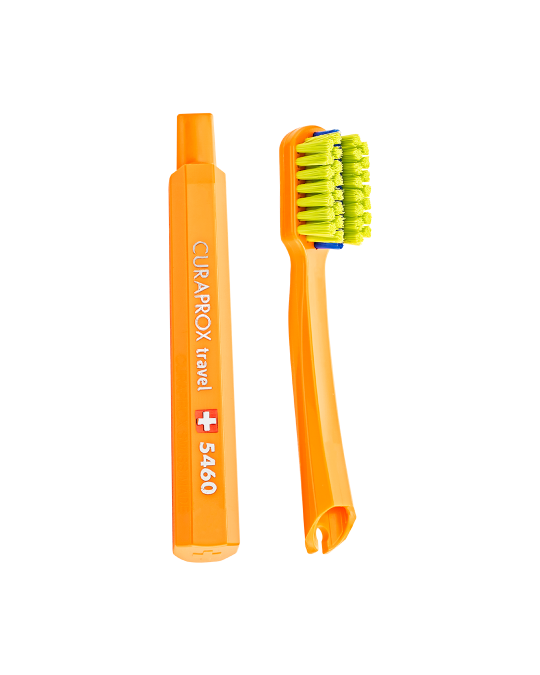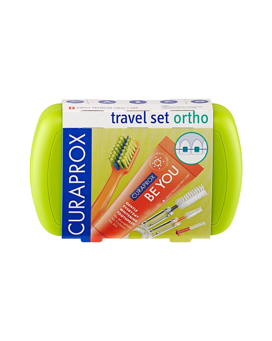Cestovný set ortho so skladacou kefkou, pastou a medzizubnými kefkami.