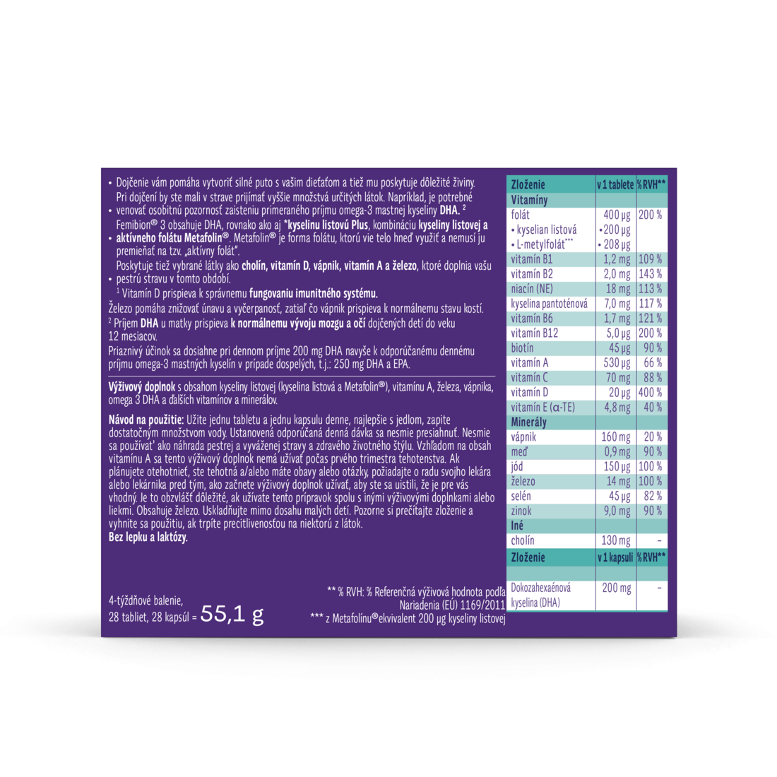 - VITAMÍNY PRE DOJČIACE MATKY S DHA, Kyselinou listovou Plus³ kyselina listová & L-metylfolát) a cholínom; DHA na podporu vývoja mozgu detí²