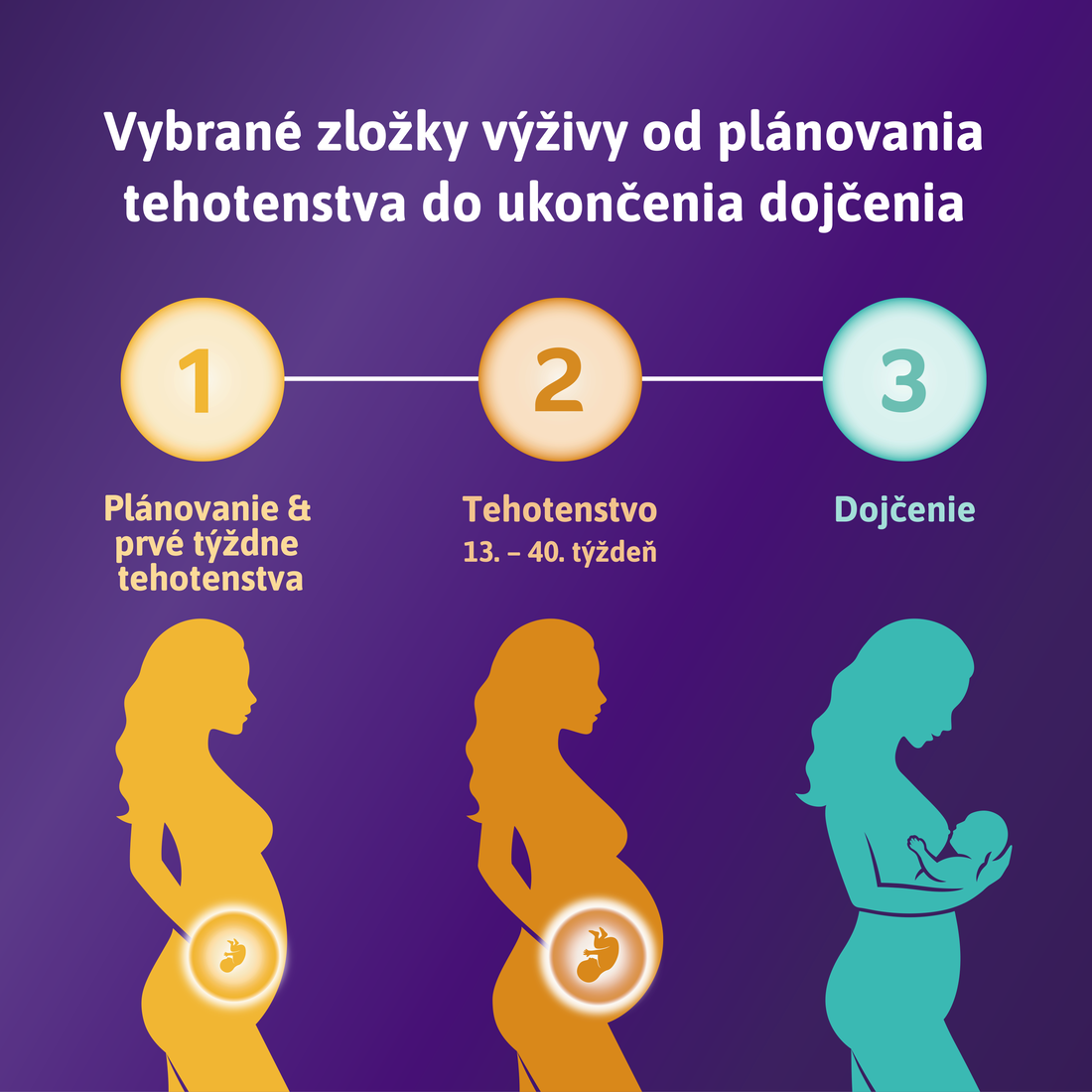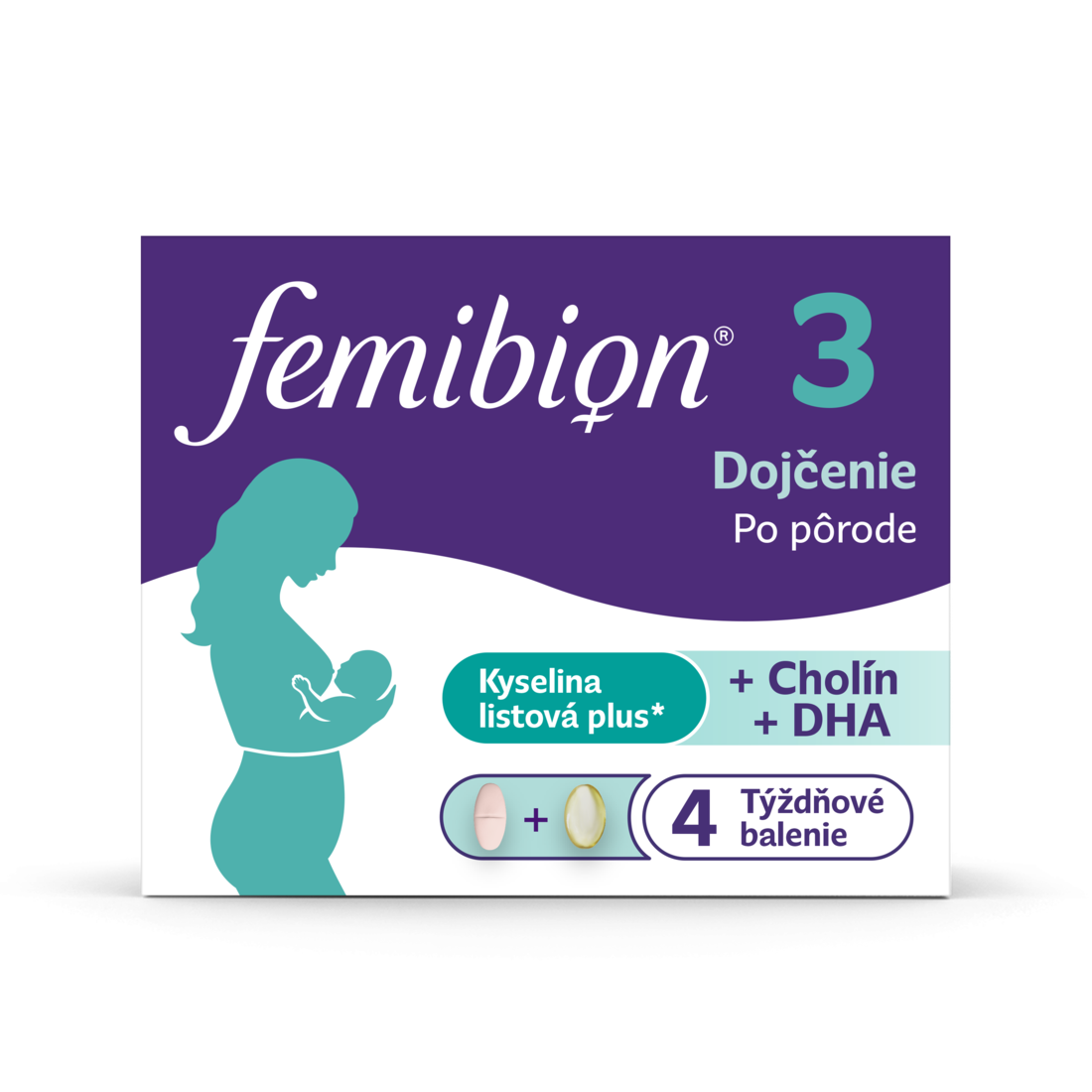 Každá fáza Femibionu má špecificky vybrané výživné látky pre plánovanie bábätka, tehotenstvo a dojčenie. Femibion 3 je špecificky vyvinutý tak, aby podporoval Vás¹ a Vaše dieťa² po narodení. Po narodení a počas dojčenia Vaše dieťa začína štádium významného vývoja. Okrem Kyseliny listovej Plus³ (kyselina listová a L-metylfolát) a cholínu obsahuje Femibion 3 aj omega-3 mastnú kyselinu DHA na podporu normálneho vývoja mozgu, očí a zraku dojčeného dieťaťa.²
