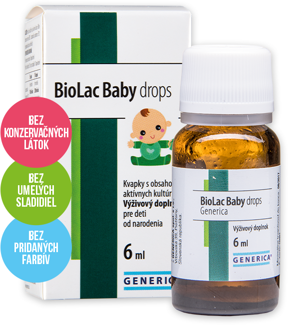 Výživový doplnok. Kvapky pre deti od narodenia s obsahom aktívnych kultúr Lactobacillus plantarum LP01 a Bifidobacterium breve BR03.