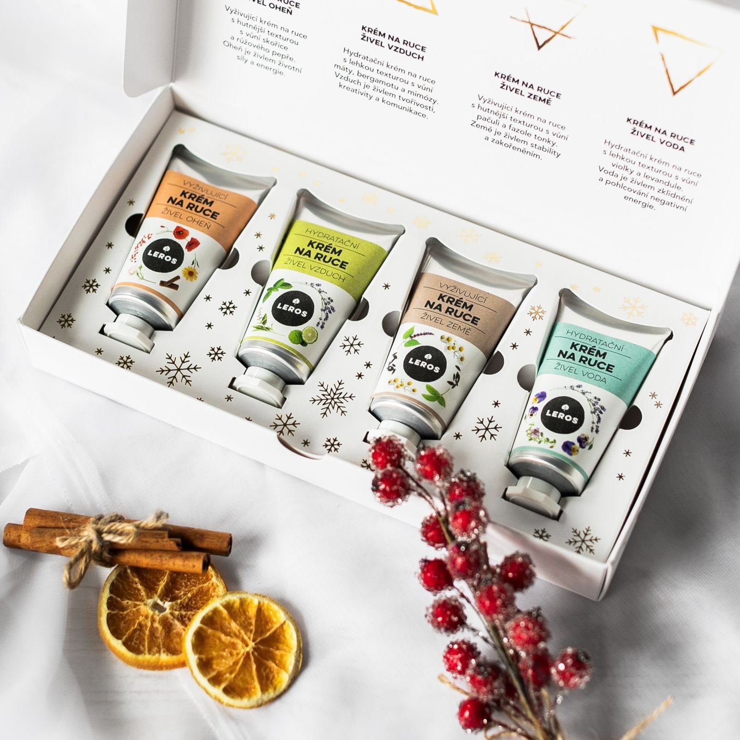 Limitovaná vianočná sada prírodných krémov na ruky inšpirovaná štyrmi základnými živlami: Ohnivom, Vodou, Vzduchom a Zemou. Každý krém v tejto kolekcii je vyvinutý tak, aby predstavoval jeden z elementov prostredníctvom vône, bylín, ingrediencií a textúr.