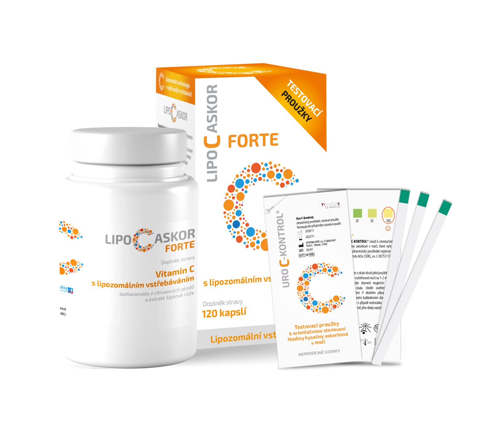 Zloženie: 1 kapsula obsahuje 520 mg RosaCelip-LD®, z toho 500 mg vitamín C (625% DDD), 10 mg bioflavonoidov z citrusových plodov, 10 mg extrakt z plodu šípok. Pomocné látky: mastné kyseliny. Kapsula je rastlinného pôvodu (HPMC). Dávkovanie: pokiaľ nie je odporúčané inak, dospelí 1 – 2 kapsule 2x denne (ráno nalačno a večer), deti od 6 rokov 1 kapsulu denne, zapiť dostatočným množstvom tekutiny, pokiaľ možno ráno nalačno. Neprekračujte odporúčanú dennú dávku. Súčasťou balenia sú indikátorové prúžky URO-C-KONTROL. Pol minúty po namočení v čerstvom moči poskytuje zafarbenie testovacieho prúžku orientačnú informáciu o tom, či je antioxidačná kapacita a všetky systémy – najmä imunitný, nervový a kardiovaskulárny – dostatočne zabezpečené vitamínom C, a to na fyziologickej úrovni. V ideálnom prípade (žlté sfarbenie) je potrebné v danom dávkovaní pokračovať alebo v prípade nedostatku vitamínu C v organizme (zelené sfarbenie) jeho dennej dávky navýšiť. Tento postup je veľmi dôležitý, pretože denná potreba a spotreba vitamínu C vychádza z nárokov na organizmus, a to najmä z jeho psychickej a fyzickej záťaže (napríklad v čase choroby a rekonvalescencie, školskej dochádzky, športovej aktivity a pod.).