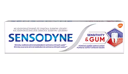 Sensodyne Sensitivity & Gum je zubná pasta s overeným účinkom pre zmiernenie citlivosti zubov a zlepšenie zdravia ďasien.** Jej zloženie s dvojitým účinkom funguje dvoma spôsobmi. Vytvára ochranú vrstvu nad citlivými miestami zubov, čím zmierňuje ich citlivosť* a zároveň cielene bojuje s baktériami v zubnom povlaku čo vedie k zníženiu problémov s ďasnami. Pre dvojitú ochranu pri citlivosti zubov a problémov s ďasnami vyskúšajte zubnú pastu Sensodyne Sensitivity & Gum.