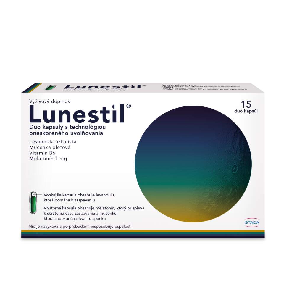 LUNESTIL® vo svojej revolučnej duo kapsule (jedna kapsula v druhej) skombinoval štyri zložky. Tento doplnok nie je návykový a po prebudení nespôsobuje ospalosť. Nedostatočný spánok môže mať viacero príčin, ako je prechodný stres, nedostatočná spánková hygiena, zmeny životného štýlu alebo emocionálne zmeny. Stres a napätie spôsobujú, že ste neustále bdelí. Keď ste v napätí, veľmi ťažko dosiahnete zdravý nočný spánok. Ak máte pravidelne zlý spánok, pravdepodobne skončíte v začarovanom kruhu. Počas dňa sa nedokážete koncentrovať a máte slabšiu výkonnosť a následkom toho sa nad tým trápite po celú noc.