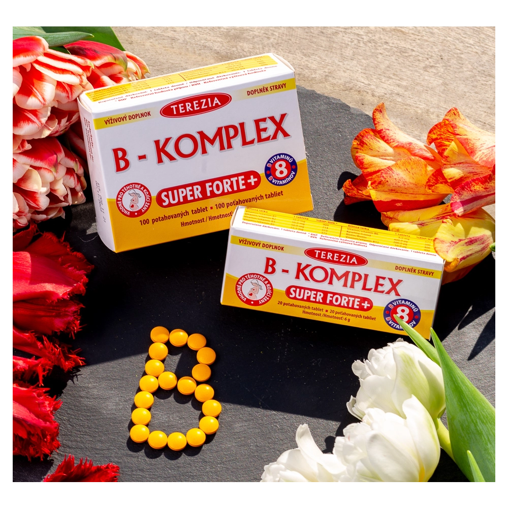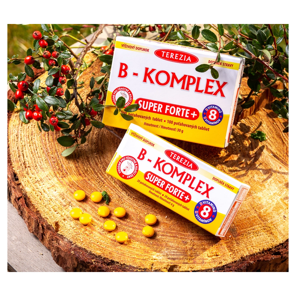 B-komplex super forte+ je obohatený o vitamíny B7, B9 a B12 a obsahuje aj kyselinu listovú. Tieto vitamíny sú pre ľudský organizmus veľmi dôležité. Účinky všetkých 8 vitamínov sa navzájom dopĺňajú a podporujú. Hlavným zdrojom vitamínov skupiny B z potravy sú kvasnice, mäso, syry, celozrnné obilniny, strukoviny a orechy. Produkt je určený k doplneniu bežnej stravy pre deti od 12 rokov a pre osoby, ktoré majú nedostatok vitamínu B. Vitamíny B1, B3, B7 a B12 prispievajú k normálnej funkcii nervovej sústavy a k psychickej činnosti.