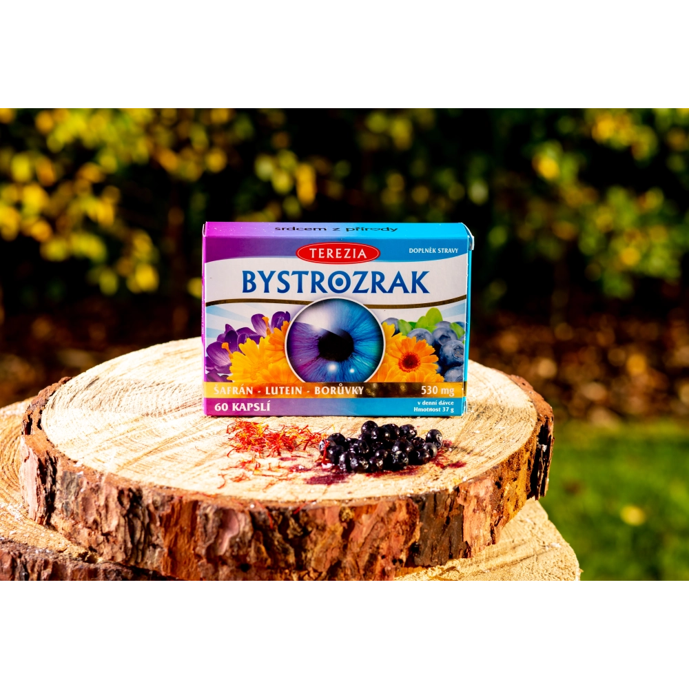 Prírodný výživový doplnok pre vaše oči obsahuje očianku a nechtík lekársky, dobre známy svojimi blahodarnými vlastnosťami, zároveň je prírodným zdrojom luteínu – žltooranžového farbiva, ktoré sa koncentruje v sietnici oka. Vysoko cenný extrakt šafranu siateho je zdrojom krocínov (3 %), karotenoidov s rýchlym vstrebávaním do organizmu. Farebnosť karotenoidov predurčuje schopnosť pohlcovať modré svetlo. Čučoriedka podporuje správnu funkciu očnej sietnice a videnia, podporuje prietok krvi do oka mikrocirkuláciou vlásočnicami. Ako zdroj antioxidantov, zhodne s kurkumou, predstavuje prirodzenú obranu proti voľným radikálom, ktoré vznikajú aj pôsobením modrej časti viditeľného svetla. Zinok z tekvicových semienok prispieva k udržaniu normálneho zraku.