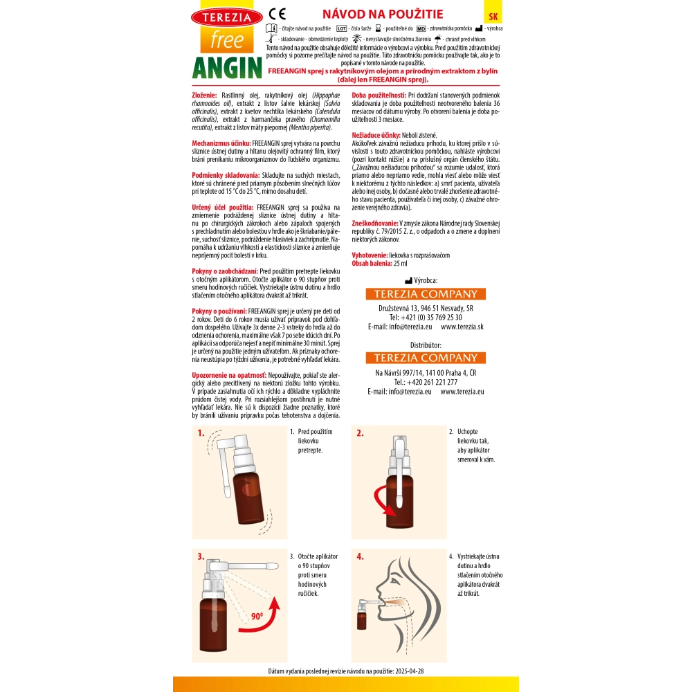 FreeANGIN sprej bol vyvinutý na rýchlu úľavu pri bolestiach a škrabaní v hrdle. Tvorí ho silná kombinácia rakytníkového oleja, extraktu zo šalvie, nechtíka, harmančeka a mäty piepornej. Používa sa na zmiernenie podráždenia slizníc ústnej dutiny a hltanu po chirurgických zákrokoch, alebo na podráždené hlasivky. Emulzia vytvára na postihnutom mieste ochranný film, ktorý zabraňuje vysušovaniu sliznice, a súčasne zabraňuje škodlivým mikroorganizmom preniknúť do tela. Sprej FreeANGIN tak dokazuje veľkú pravdu, že sila liečivých byliniek sa vždy spája s láskyplnou ochranou, ktorá je pre bylinky tak príznačná.
