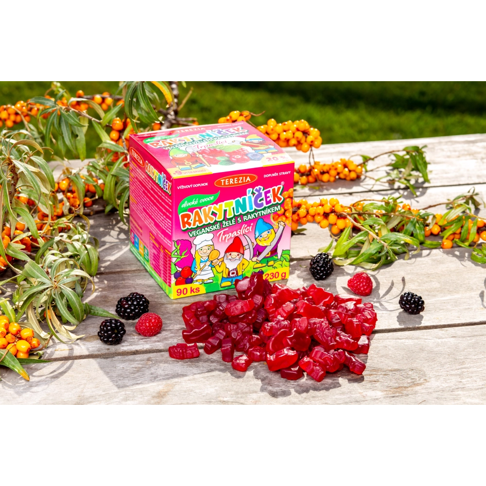 Vegánske želé sú plné tých najdôležitejších vitamínov pre vaše deti. Šťavnaté želé majú podobu roztomilých trpaslíkov. Každé želé v sebe ukrýva zmes ovocných koncentrátov, vitamíny a rakytník, teda perfektnú kombináciu pre posilnenie detskej imunity. Rakytník navyše pomáha znižovať únavu, podporuje činnosť srdca a tráviaceho traktu, pomáha udržiavať zdravú pokožku. Multivitamínové maškrtenie si malí objavitelia môžu brať so sebou na tábory, krúžky, do školy alebo môže slúžiť ako pravidelná odmena za zvládnutie ďalšieho náročného dňa. Pretože chápeme, ako vysoko citlivý detský organizmus je, želéneobsahujú konzervačné látky, sladidlá a ani pridané farbivá.