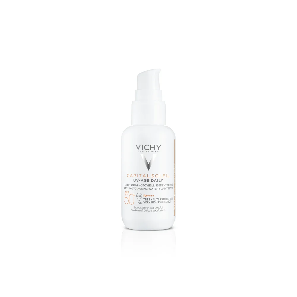 VICHY UV-AGE Daily Tónovaný Fluid zabráňujúci fotostarnutiu SPF50+. VEĽMI VYSOKÁ OCHRANA. S obsahom Termálnej vody Vichy vulkanického pôvodu, s probiotickými frakciami, peptidmi a Niacínamidom. Patentovaná technológia NETLOCK: technológia ultratenkého filmu ukotvujúceho širokospektrálne filtre pre ľahký, nemastný finiš. Pomáha predchádzať vráskam, tmavým škvrnám a oxidačnému stresu v dôsledku UV žiarenia a znečistenia. Pomáha korigovať vznik tmavých škvŕn a stratu plnosti pleti. Zjednocuje odtieň pleti vďaka prirodzenému krytiu.